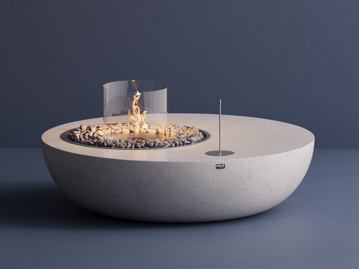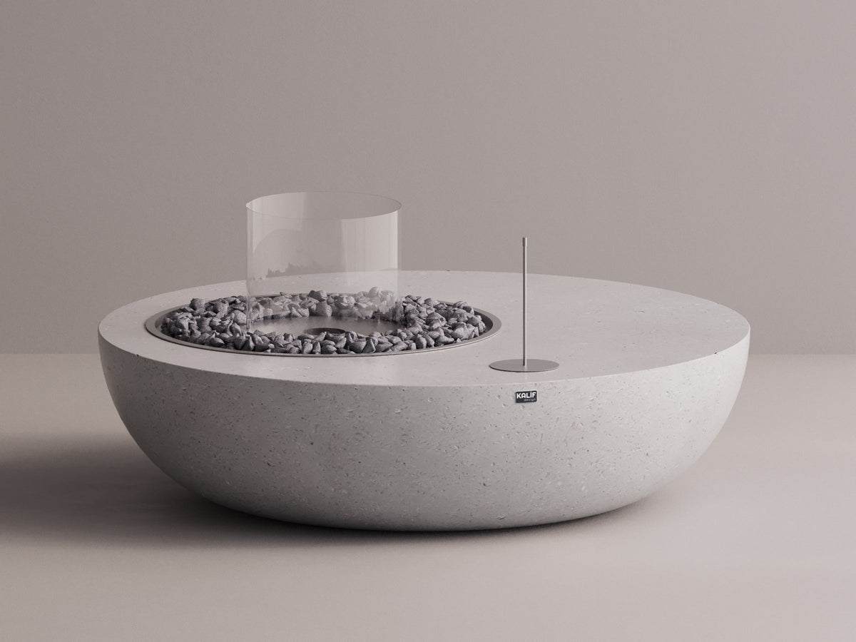 Het tafelfunctionele vuurputmodel Arao Geniş, met een bio-ethanol brandstofsysteem, is verkrijgbaar in twee verschillende maten. Bij gebruik buitenshuis veroorzaakt het geen kleurvervaging of krassen. Het is gemaakt van een natuurlijk stenen mengsel dat 75% lichter is dan gegoten beton. Dankzij de ijzeren verstevigingen binnenin is het zeer bestand tegen sterke schokken. Het is gepolijst met een eersteklas oppervlakteafwerking en kan langdurig worden gebruikt. Het is volledig met de hand vervaardigd. U kunt vuur stoken op de metalen plaat die bij de betonnen vuurput wordt geleverd.