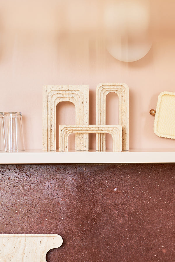 De unieke textuur van natuursteen en het minimalistische ontwerp trekken de aandacht. Elk travertinplaat heeft een uniek patroon dat natuurlijke diepte toevoegt. De natuurlijke tinten van het travertin op de deur spelen met het licht en voegen warmte en elegantie toe aan de ruimte.