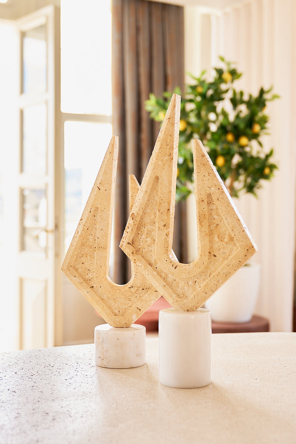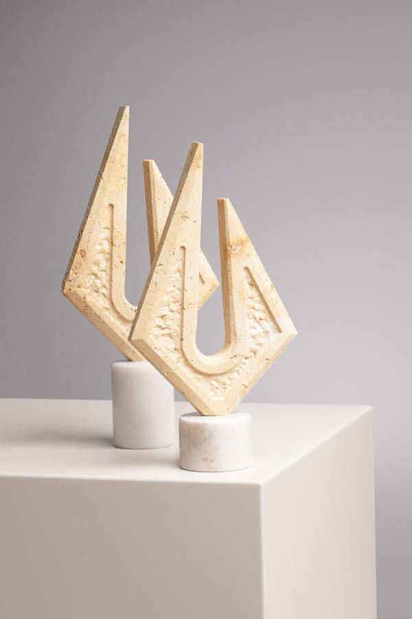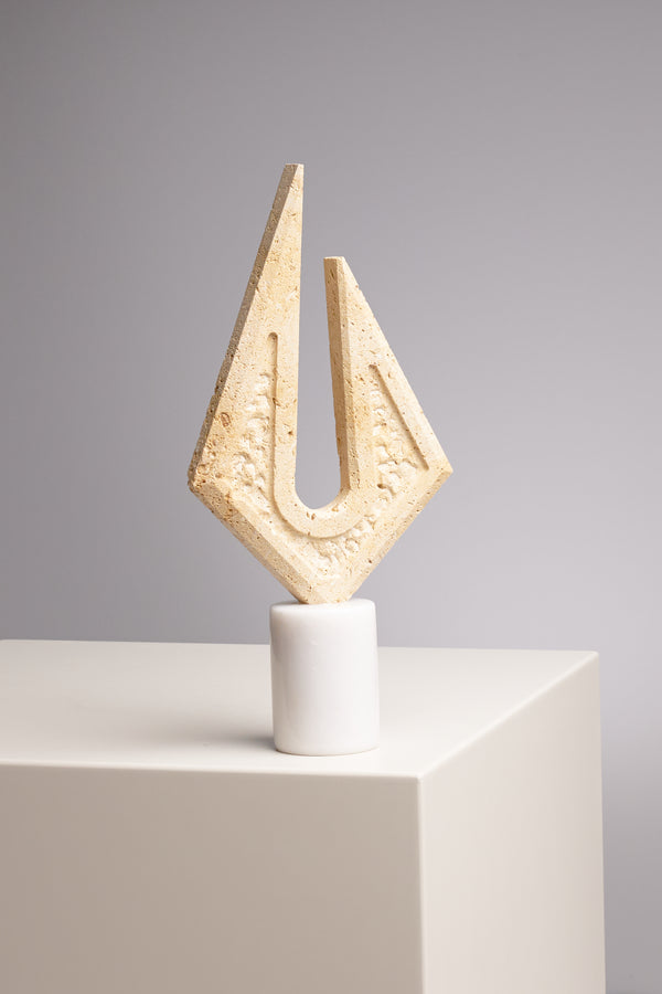 Dit beeldhouwwerk, dat moderne architectonische lijnen en de textuur van natuursteen samenbrengt, brengt elegantie en kunst naar de ereplaats in uw huis. Dit werk, dat opvalt door zijn geometrische details en minimalistische uitstraling, voegt een verfijnde touch toe aan elke ruimte.