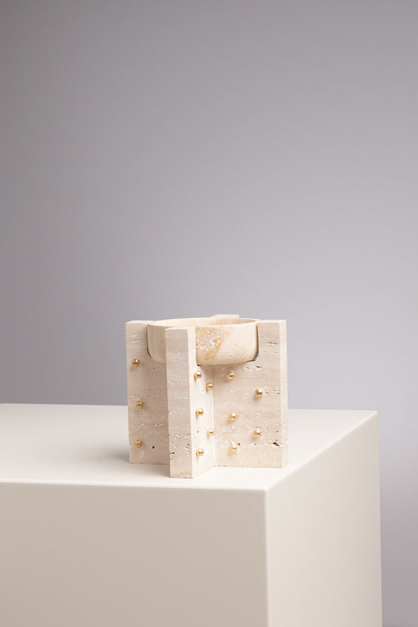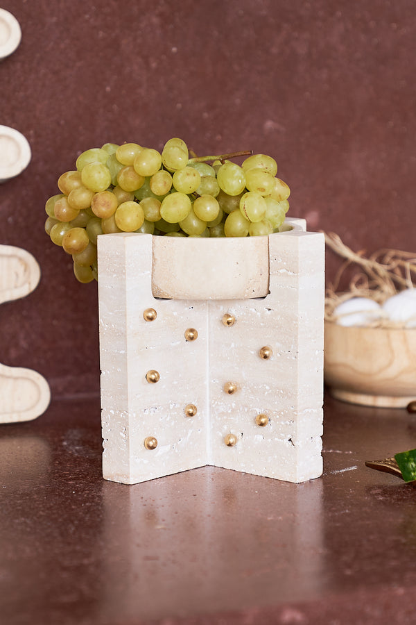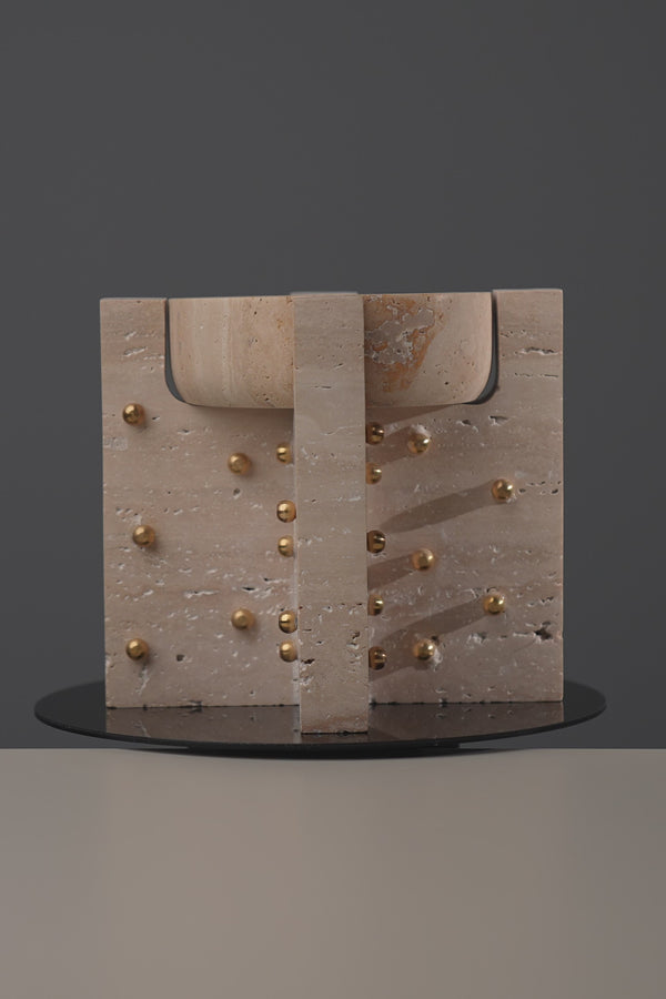 Deze opstaande travertijnen vaas, versierd met gouden details, biedt opvallende elegantie met zijn eenvoudige ontwerp. De unieke textuur van het natuurlijke travertijn komt samen met een moderne esthetiek, waardoor het een verfijnde en elegante sfeer in elke ruimte creëert. Dit unieke stuk voegt een natuurlijke elegantie toe aan de decoratie, terwijl het met zijn opstaande ontwerp ook de aandacht trekt.