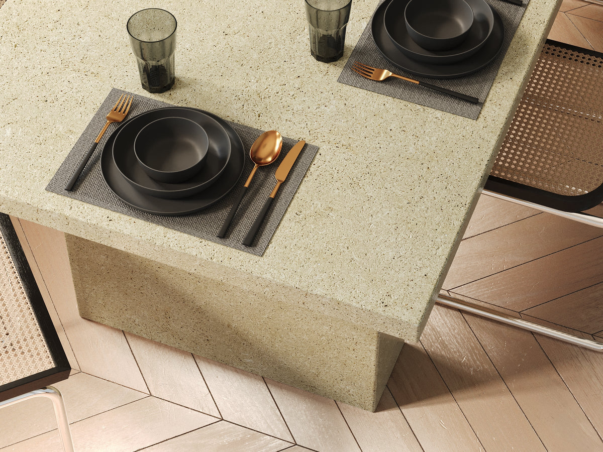 Tartarus, een tweebenig, vlak tafelmodel, is volledig met de hand vervaardigd in verschillende maten en kleuren. Het heeft een vlekbestendig oppervlak en dankt zijn kleuren aan de natuurlijke stenen die erin verwerkt zijn. De Tartarus-tafel is gemaakt van producten van de hoogste kwaliteit en is gepolijst met een laklaag, waardoor het geschikt is voor zowel binnen- als buitengebruik. Dankzij de ijzeren versterkingen is het bestand tegen hoge belastingen. In vergelijking met gietbeton is de Tartarus 75% lichter, wat het duurzaam en kostenefficiënt maakt. Het waterafstotende oppervlak zorgt ervoor dat het bestand is tegen barre weersomstandigheden.